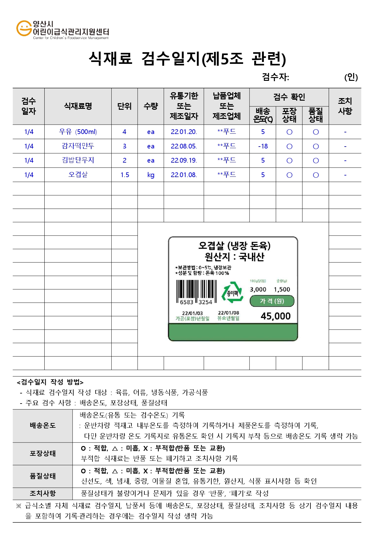 [서식자료] 집단급식소 식재료 검수일지(제5조 관련)