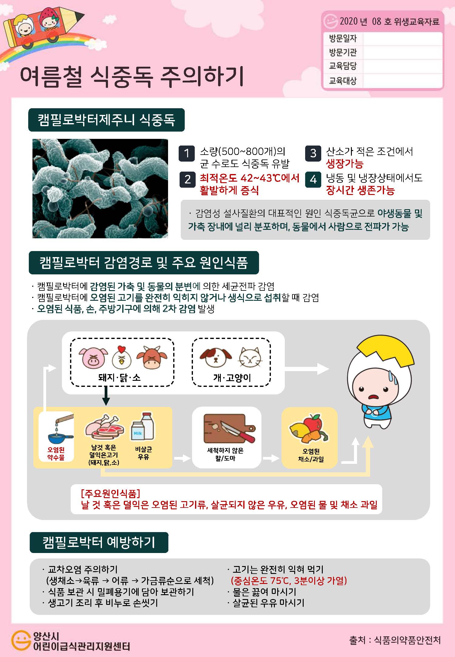 이번 08호 위생교육자료 주제는 <여름철식중독주의하기-캠필로박터>입니다.