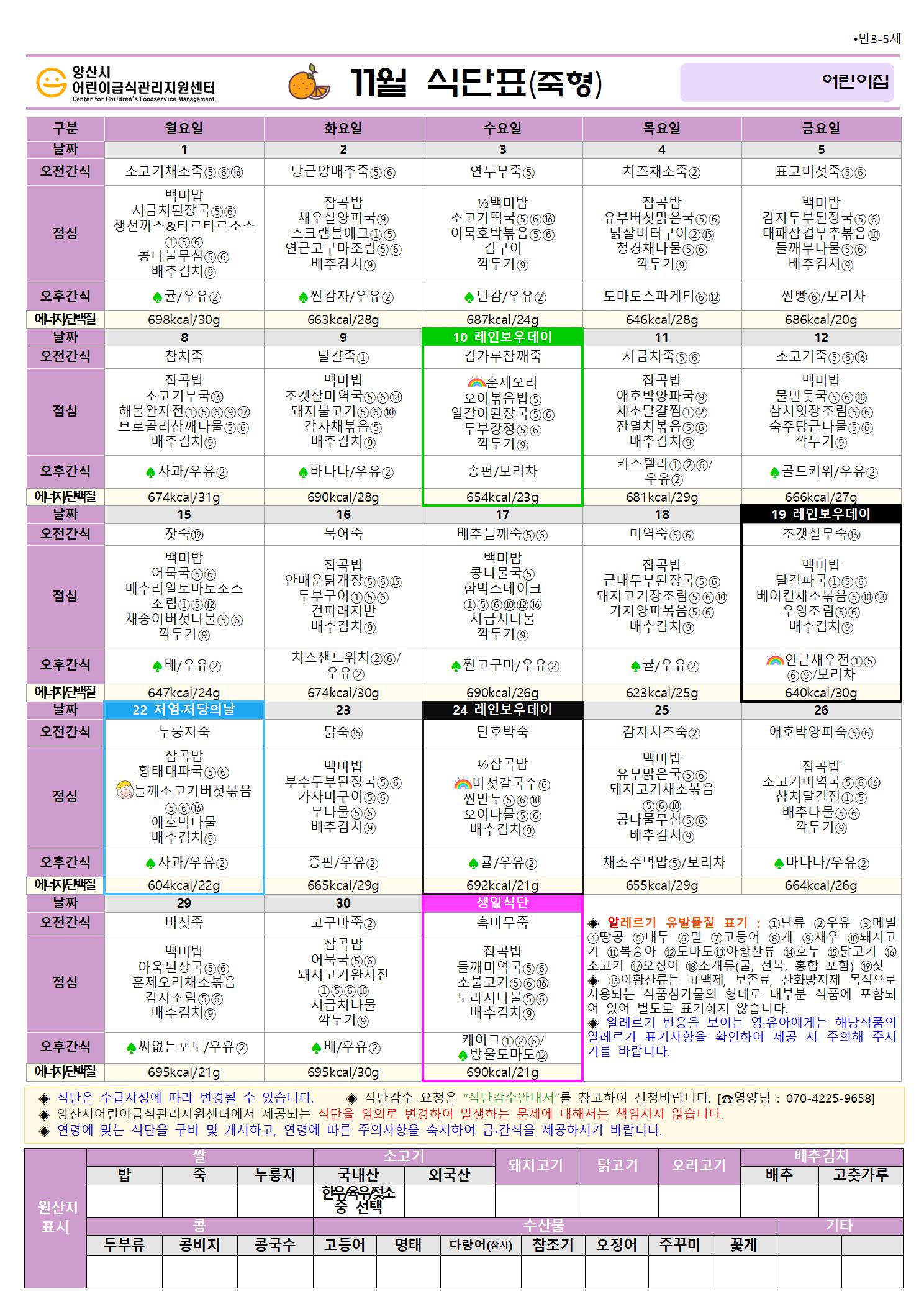 11월 식단(만3-5세 오전죽형)-5일형