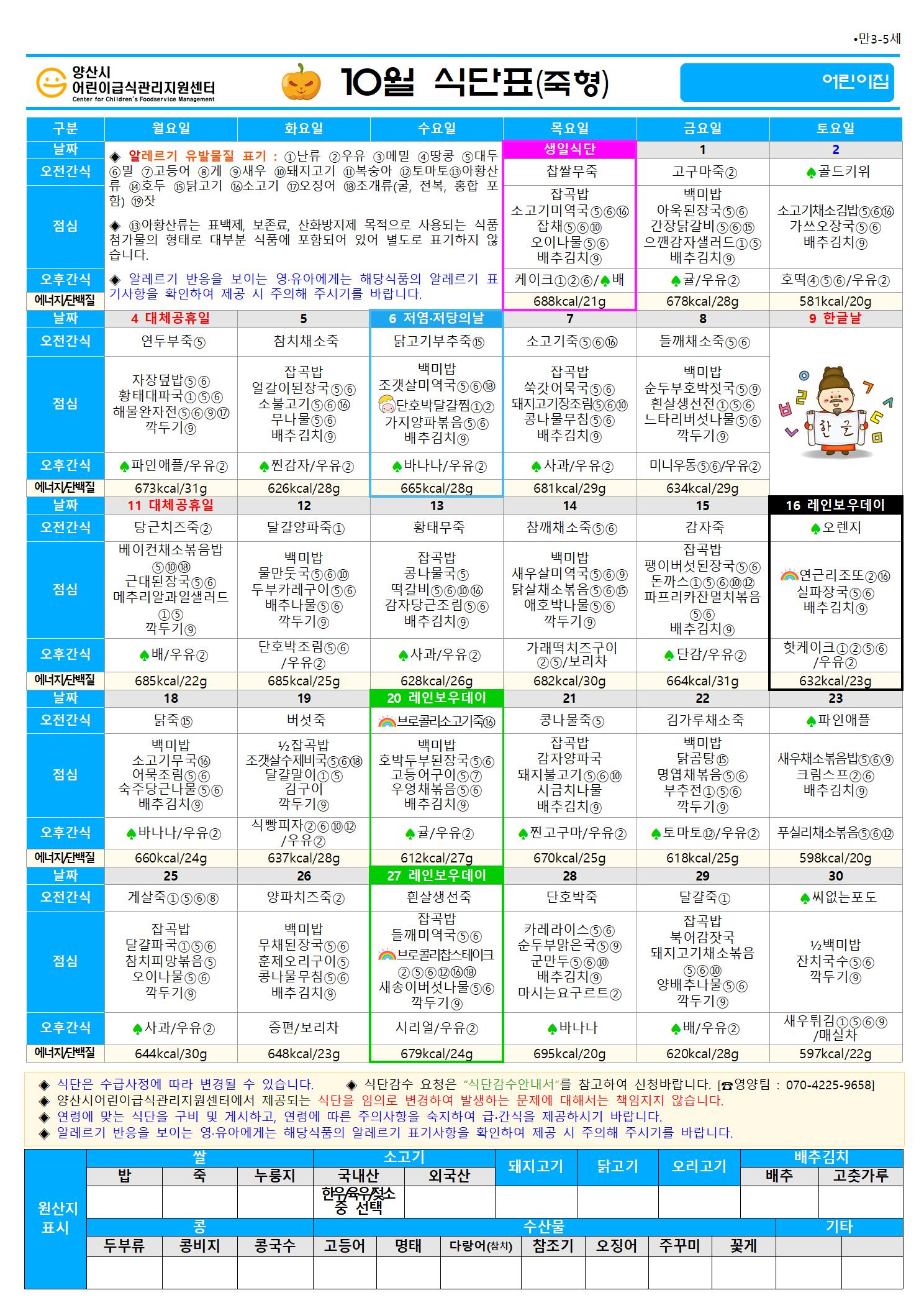 10월 식단(만3-5세 오전죽형)-6일형