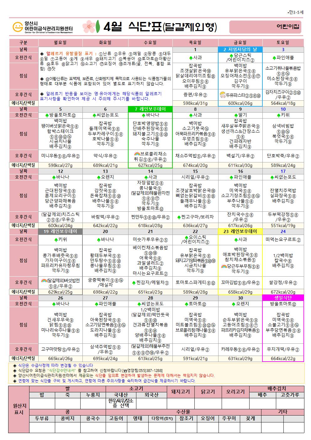 4월 식단(만3-5세 달걀제외식단)