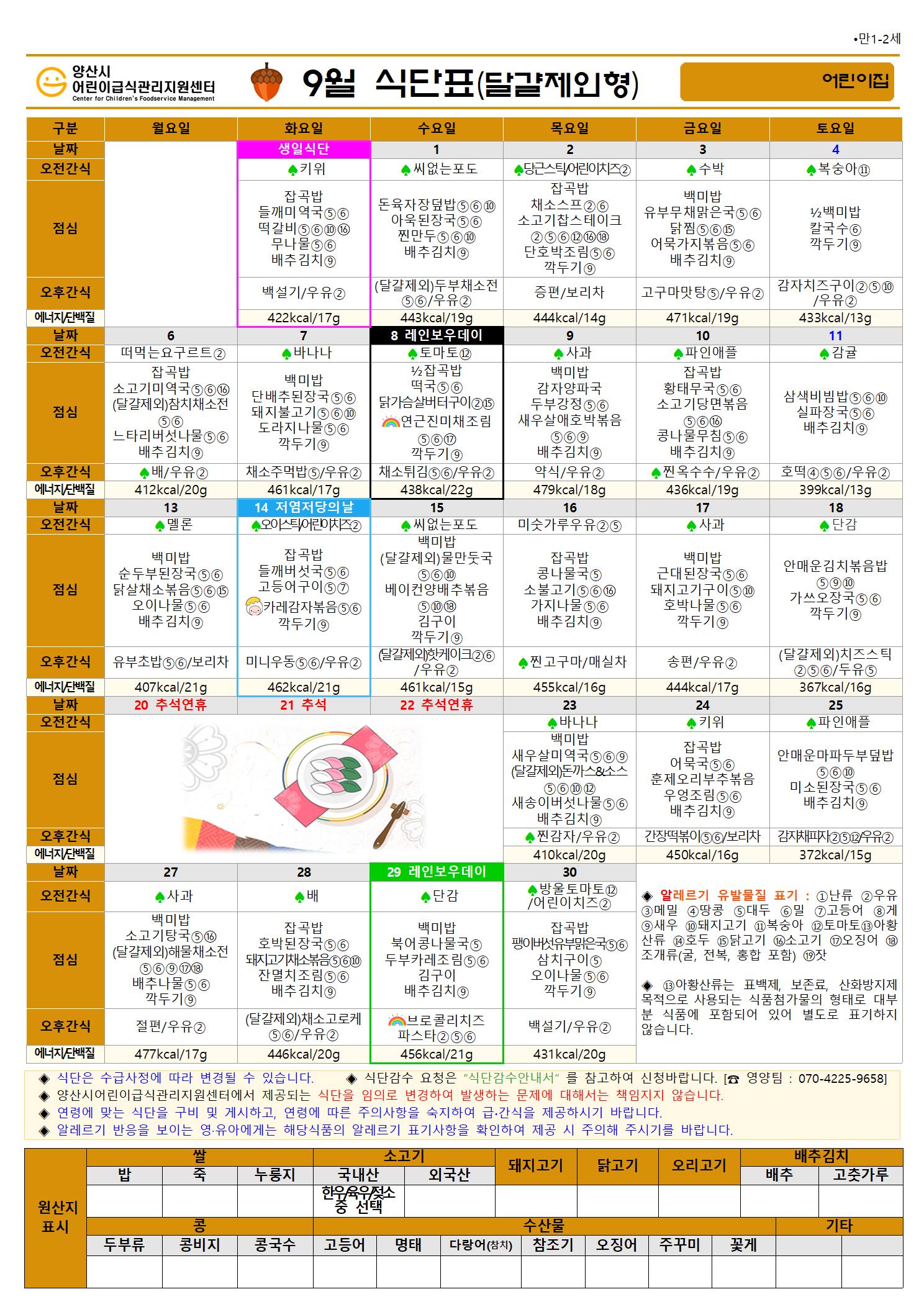 9월 식단(만1-2세 달걀제외형)